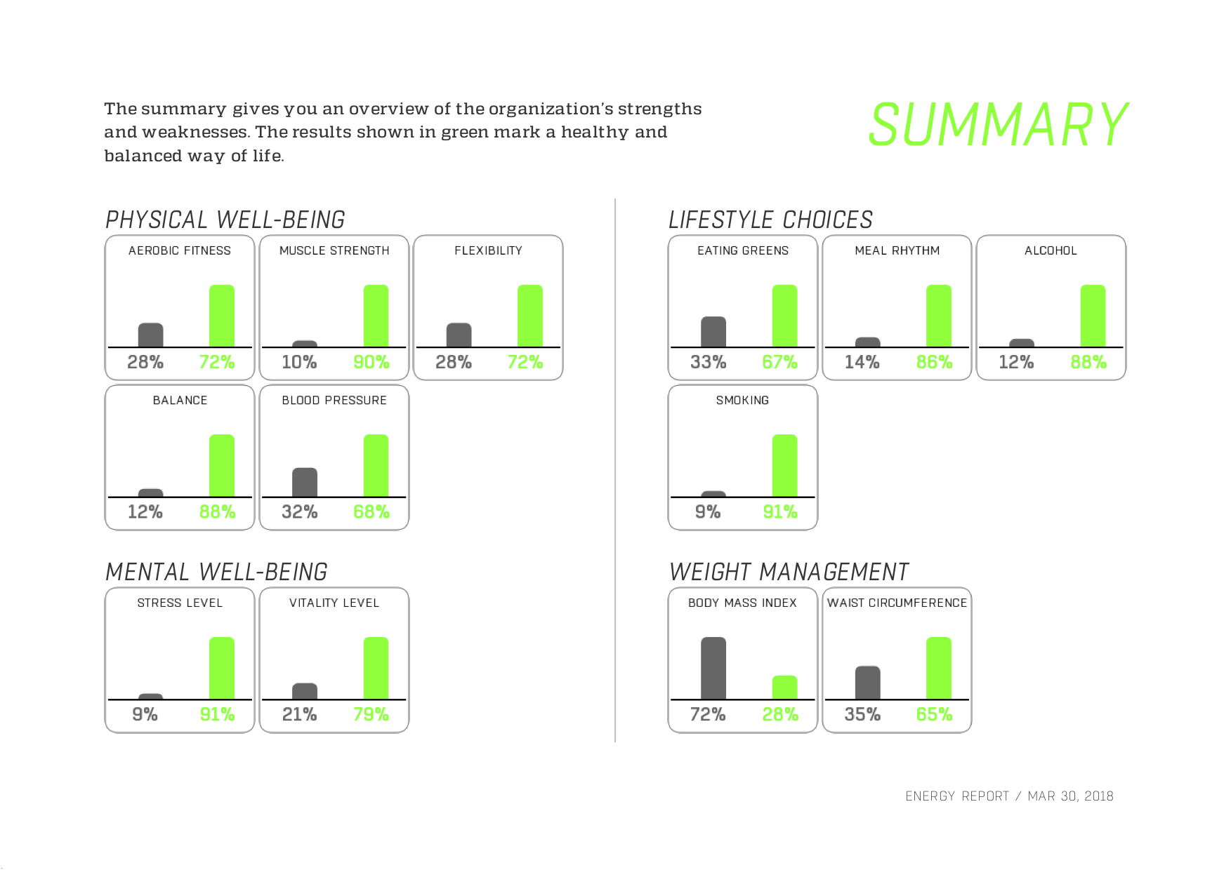 Each participant also receives their own Individual Report, which contains the results of each test subsection. The results are easily interpretable, because the more green the better. In gray you can see the areas that by improving you will improve your well-being.